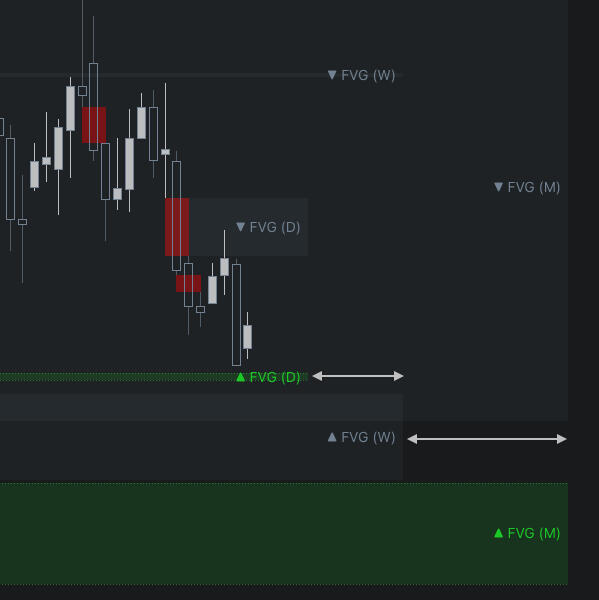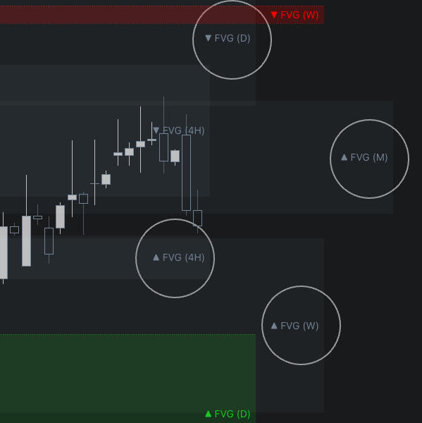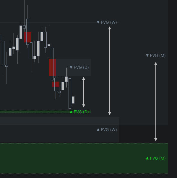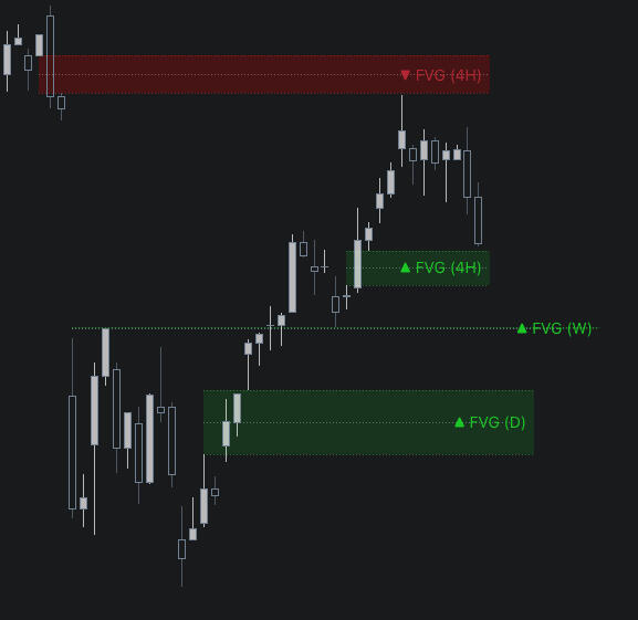 Visualization of up 9 timeframes simultaneously, with FVGs displayed using proportional lengths creating visual hierarchy per timeframe