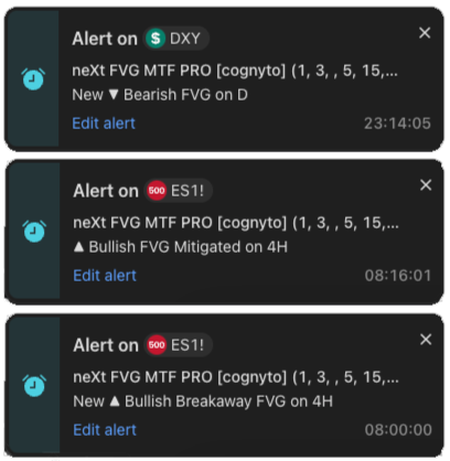 Real-time alert system for critical events, with customizable notifications per timeframe for new FVGs, Mitigations, and Breakaways
