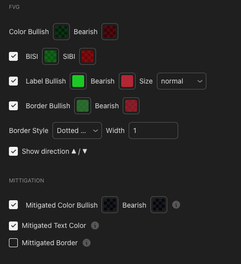 Mitigated visualization, showing where price reached equilibrium with color-coded displays. Users can choose to hide mitigated FVGs